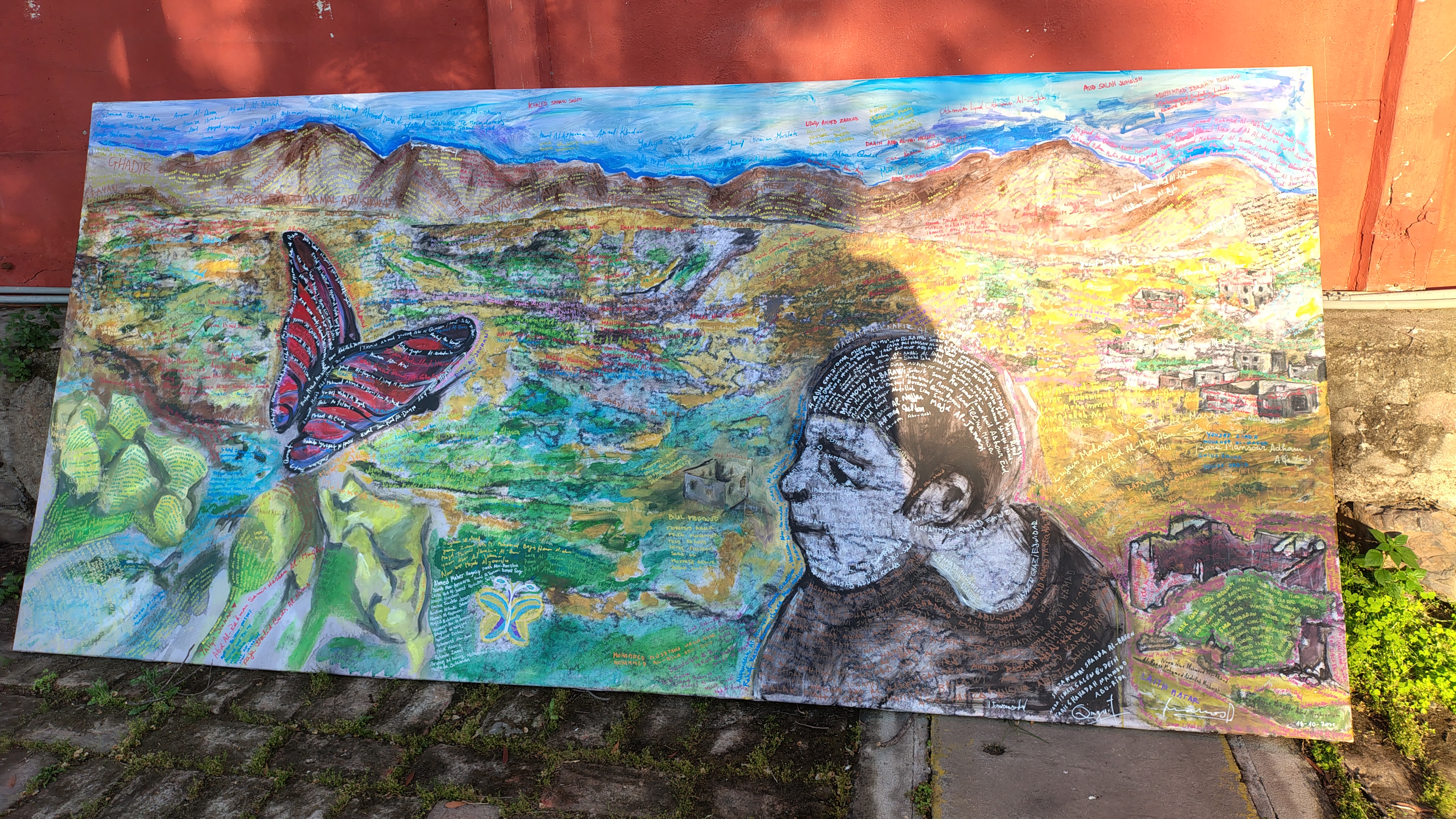 Asimismo, en otra iniciativa que se sumó a este homenaje, varios artistas pintaron un gran cuadro en el que, dentro de su paisaje, se pueden leer dibujados en los contornos de los elementos que lo componen, los nombres de muchas niñas y niños víctimas del genocidio.