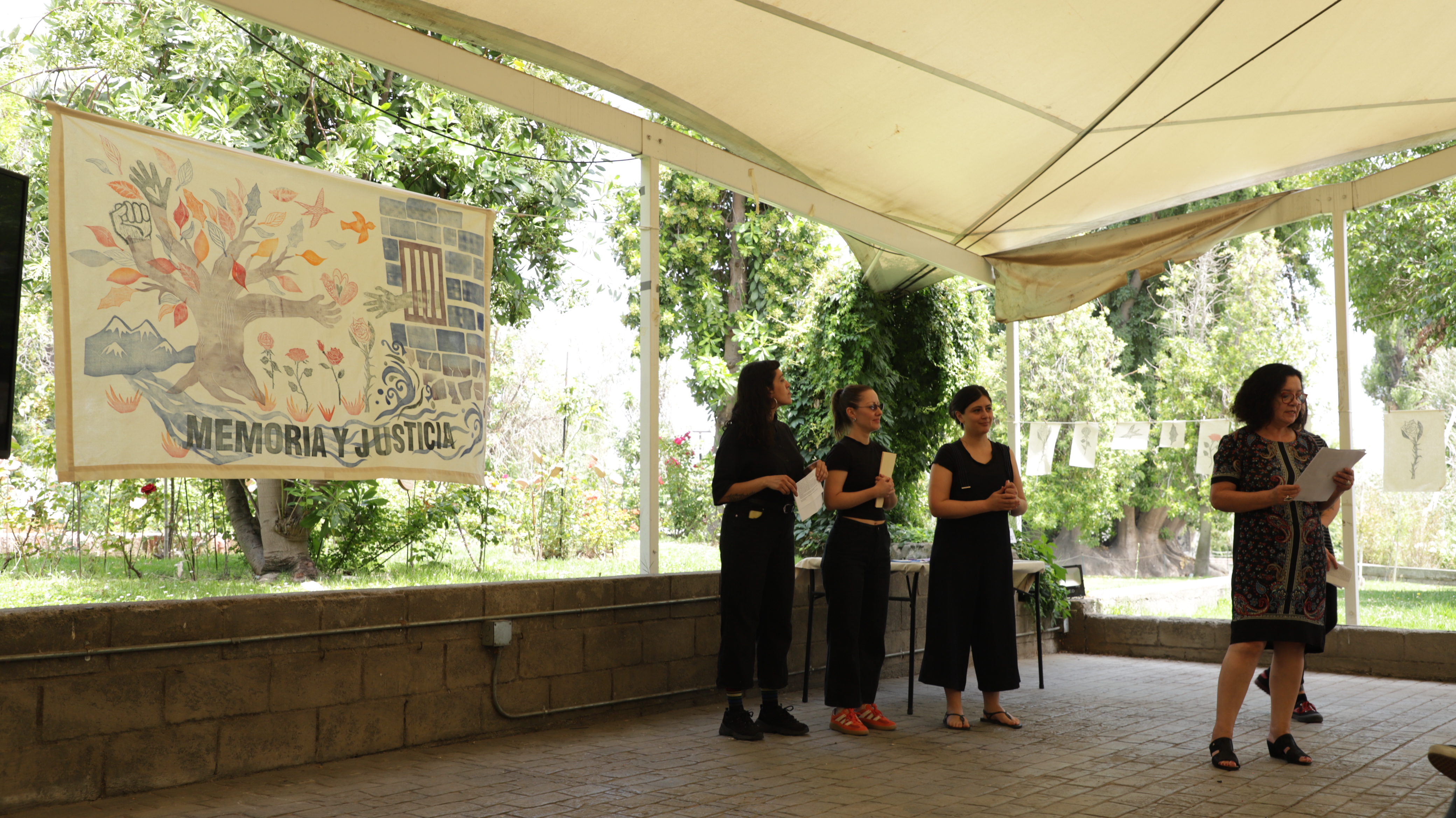 La secretaria general de la Corporación Parque por la Paz Villa Grimaldi, Marcela Espinoza, fue quien, a nombre del directorio, recibió este valioso trabajo, señalando que “para nosotros este lienzo es más que un objeto: es el reflejo de un trabajo colectivo en el que nosotros creemos mucho y que durante cuatro sesiones tejieron historias, emociones, sueños y memorias”. Esto, agregó la directora, “tiene que ver con el trabajo que aquí realizamos que es, por una parte, guardar y preservar la memoria y, por otra, educar y promover los derechos humanos”.