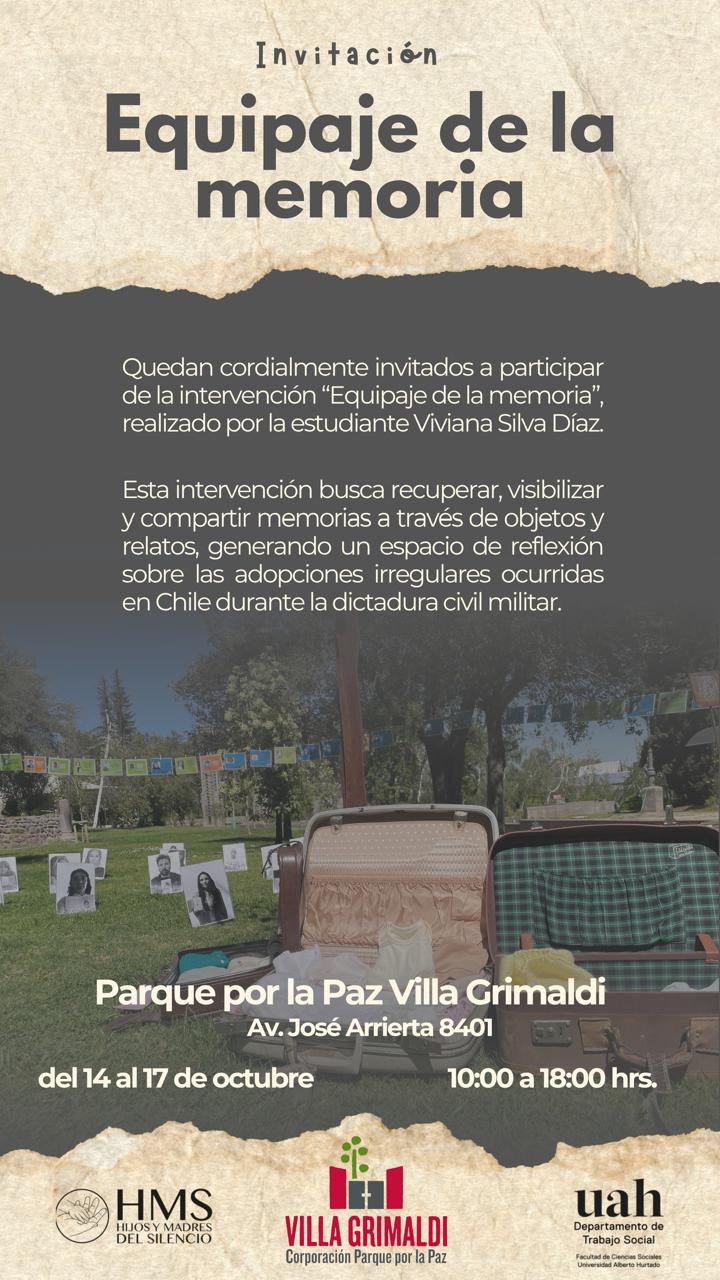 En el marco de su tesis “Contra el olvido: El rol de las organizaciones civiles en la construcción de la memoria sobre las adopciones irregulares en dictadura. El caso de Hijos y Madres del Silencio (2014-)”, la estudiante en práctica Viviana Silva Díaz, de quinto año de Trabajo Social de la Universidad Alberto Hurtado, desarrolla en nuestro Parque la Intervención “Equipaje de la Memoria”, la que busca recuperar, visibilizar y compartir memorias a través de objetos y relatos, generando un espacio de reflexión sobre las adopciones irregulares ocurridas en Chile y que cuenta con el apoyo de la Fundación “Hijos y Madres del Silencio”.